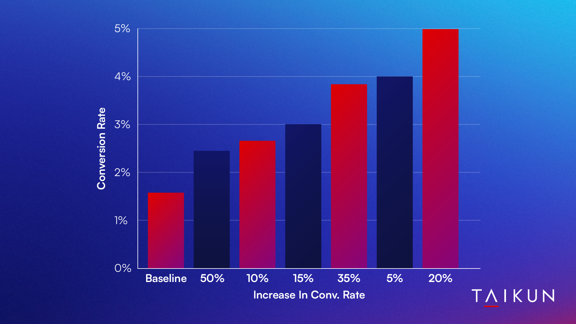 In contrast, a lot of low-hanging fruit is typically immediately available when starting a CRO program. By developing a hypothesis or even hypotheses for a series of changes for a new version of the landing page, and running that new page as a test, it’s not at all unrealistic to increase a conversion rate by 50%. For example, an increase from a 3% conversion rate to 4.5%. Results vary but for the sake of simplicity, it’s reasonable to expect 5x to 10x more improvement in marketing efficiency right off the bat when starting a CRO program compared to just running a mature creative testing program.