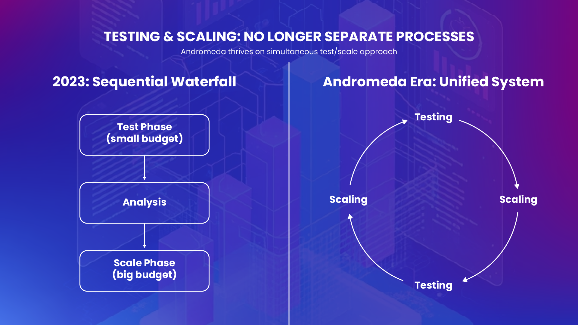 The line between testing and scaling has blurred. Instead of the traditional “test small, then scale winners” approach, we’re: